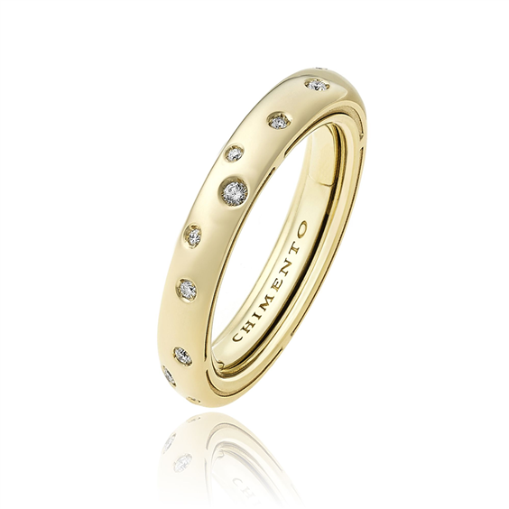 Gioiello della collezione Brio. Anello in oro giallo. Le collezioni FOREVER si distinguono per la straordinaria adattabilità dei suoi anelli alle forme del corpo, e per un design inconfondibile dal carattere forte e deciso. Gioielli che non passano inosservati, realizzati per affermare e rafforzare la propria personalità e il proprio stile. Realizzati in oro 18 kt e diamanti, gli anelli adottano tutti al loro interno il meccanismo brevettato Size-Fit™️. BRIO Gli anelli della collezione FOREVER Brio hanno un design giocoso e divertente composto da piccoli pois di diamanti bianchi, posizionati a distanze irregolari e incastonati su anelli a fascia, disponibili in varie dimensioni.