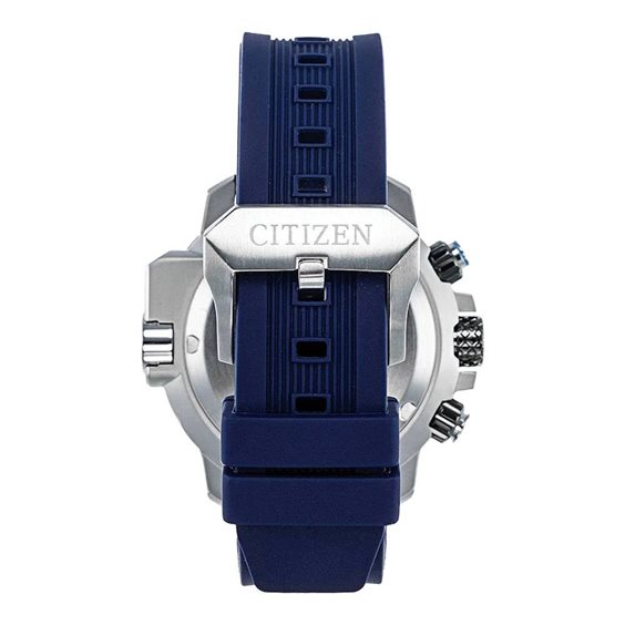 Orologio Uomo Diver's con Cronografo e Profondimetro. Ideale per immersioni. Cassa in acciaio, fondello e corona e pulsanti a vite con ghiera unidirezionale colore blu e azzurro. Vetro zaffiro . Movimento Eco Drive con riserva di carica di 2 mesi con funzione di cronografo e profondimetro con memorizzazione profondità massima raggiunta. Quadrante nero con indici e sfere ad alta visibilità con indicatore di profondità e riserva di carica. Cinturino in morbido Poliuretano blu con logo e prolunga per estensione, fibbia con ardiglione . Impermeabile 20 bar (atm) Certificato ISO 6425 . Originale cofanetto porta orologio, prolunga, libretto istruzioni e garanzia 2 anni.