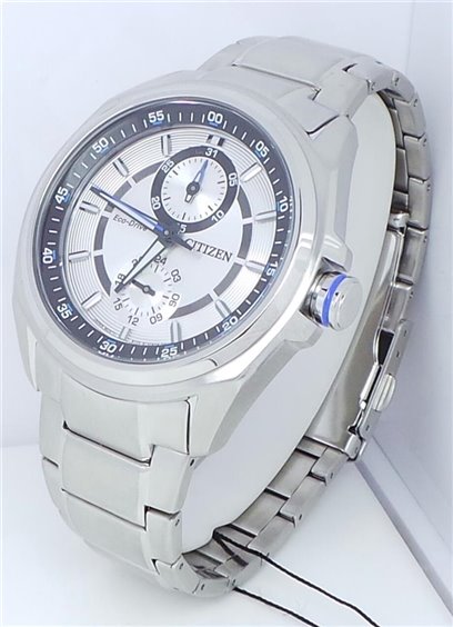 Orologio uomo , movimento ECO-DRIVE a carica luce con riserva di carica di 180 giorni, cassa e bracciale in acciaio, fondello a vite, diametro cassa 43mm., impermeabile 10atm.(100m.), quadrante grigio.
