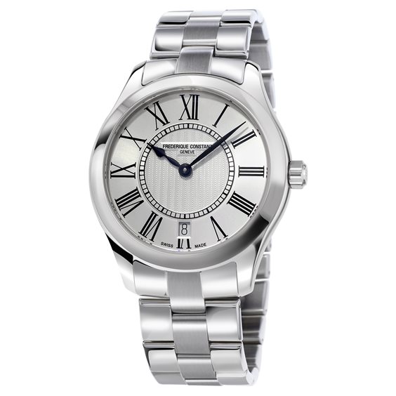 Orologio Frederique Constant Classic per donna. Movimento al quarzo, cassa in acciaio, quadrante silver con numeri romani, datario a ore 6, bracciale acciaio.