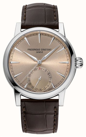 Anche se il nome continua a essere “Classic”, si tratta di un classico rivisitato: il Classic Date Manufacture si dota di un nuovo calibro di manifattura FC-706, che offre ora 72 ore di riserva di carica, per una garanzia portata a cinque anni. La cassa in acciaio si riduce di 2 mm per un totale di 40 mm, un diametro classico e di classe che sfoggia un nuovo quadrante sprovvisto di numeri, con indici assottigliati e una minuteria “chemin de fer”. Questo nuovo modello riflette un approccio totalmente snello. In primo luogo, il diametro della cassa è stato notevolmente ridotto, passando da 42 mm a 40 mm. Un’apertura in linea con le aspettative degli intenditori di alta orologeria, che rispecchia anche le dimensioni della maggior parte dei segnatempo senza tempo degli ultimi 50 anni. Nonostante questa sottile riduzione, il quadrante sembra più essenziale e libero che mai. La finitura soleil permette di diffondere la luce con costanza e delicatezza. Le lancette centrali, altrettanto sfaccettate al diamante (ore e minuti soltanto) e lucidate a mano, sono ormai di tipo Alpha, per armonizzarsi con il profilo degli indici. La totale assenza di numeri, romani o arabi che siano, propone una lettura aperta di ore e minuti. La precisione è garantita da una nuova minuteria di tipo “chemin de fer”. . A ore 3, ritroviamo una corona “a cipolla”.