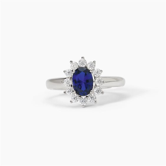 Anello da donna regolabile in argento rodiato con zaffiro sintetico taglio ovale e zirconi bianchi. • Dimensioni zaffiro sintetico: 5 x 7 mm • Diametro degli zirconi: 2 mm • Misura regolabile dalla taglia 11 alla 19 • Materiale: Argento 925, Zaffiro sintetico, Zirconi