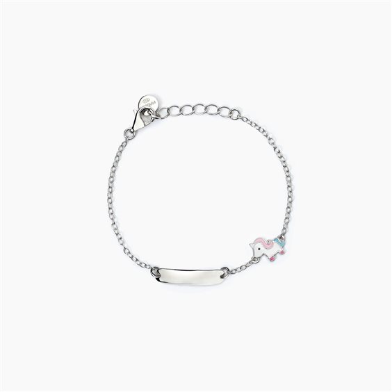 Bracciale in argento 925/°°° rodiato con catena forzatina 1.5 mm, piastra 17x4 mm ed elemento unicorno smaltato 8x7 mm, lunghezza regolabile da 12 a 14 cm