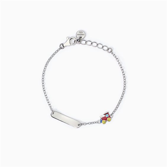 Bracciale regolabile da bambini in argento rodiato con catena forzatina, targhetta centrale e trenino smaltato. Il bracciale presenta una targhetta centrale sulla quale è possibile incidere date, iniziali o nomi.