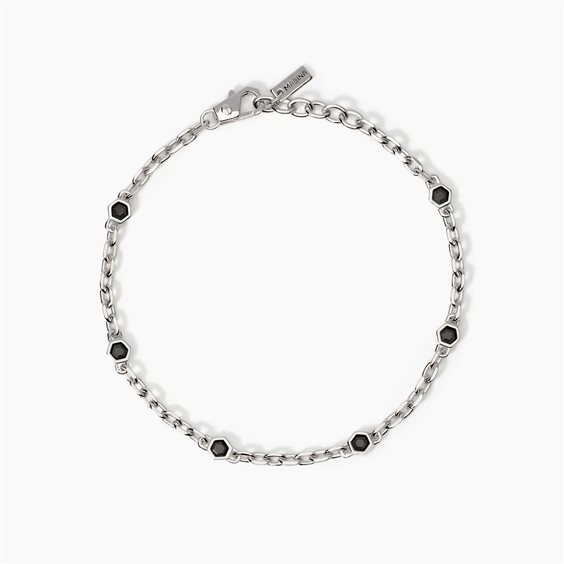 Bracciale in argento 925 rodiato e zirconi neri. Maglia forzatina, zirconi neri esagonali. Misura regolabile da cm 18,5 a cm 20,5. Chiusura a moschettone.