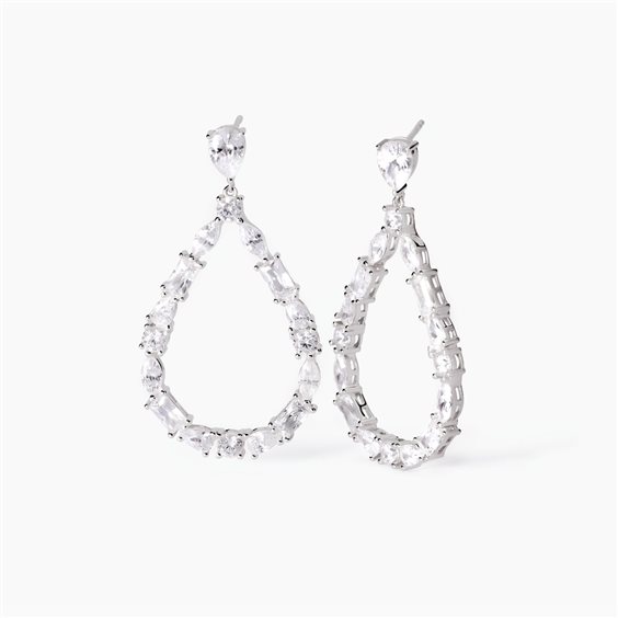 Orecchini da donna in argento rodiato con pendente a forma di goccia con navette e zirconi taglio baguette e taglio goccia. Gli orecchini pendenti hanno una larghezza di 24,5 mm e una lunghezza di 36,5 mm