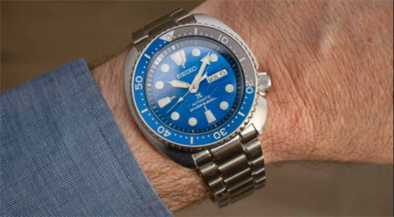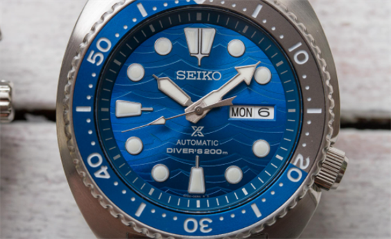 Seiko Turtle Save The Ocean edizione speciale 'great white shark' Orologio subacqueo professionale con movimento 4R36 a carica automatica(possibilità carica manuale) frequenza 21600 alternanze/ora- 24 rubini e riserva di carica oltre le 41 ore. Cassa iconica Turtle in acciaio con fondello, corona serrati a vite. Bracciale in acciaio con chiusura di sicurezza e estensione per utilizzo sopra la muta. Ghiera con lunetta girevole unidirezionale con trattamento IP blu e grigio. Meraviglioso quadrante blu azzurro con effetto RIFLESSO DELLE ONDE SULLA SABBIA SOTT'ACQUA, indici e sfere con lumibrite per visione notturna. Vetro HARDLEX brevetto seiko.