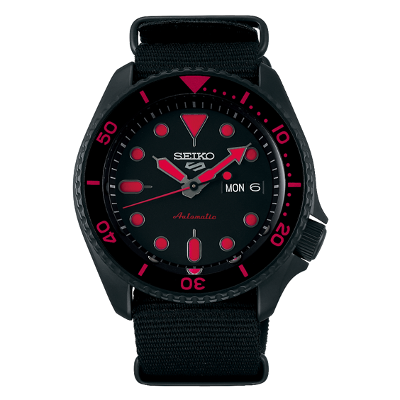 Orologio uomo seiko, collezione 5 sports, movimento automatico, cal seiko 4r36, riserva di carica 41 ore , cassa acciaio 42.5 mm. quadrante Nero con indici luminosi lumibrite e dettagli in rosso, ghiera girevole unidirezionale , vetro minerale hardlex, bracciale in tessuto nato, impermeabile fino a 10 bar, fondo Cassa in vetro.
