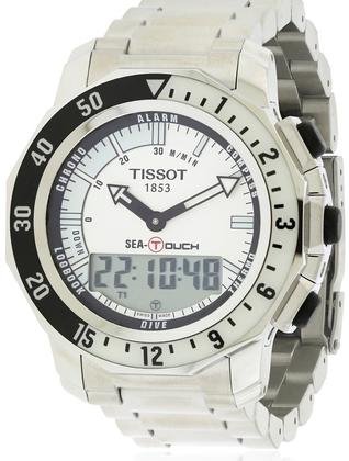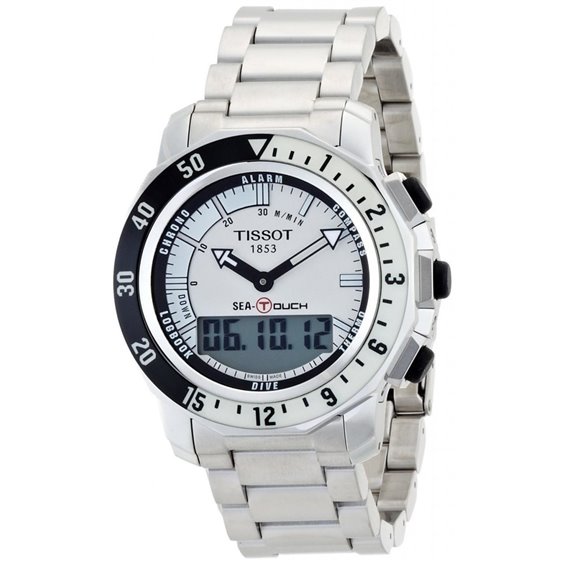 Orologio Tissot Sea Touch in acciaio movimento al quarzo ETA swiss made, multifunzione: registro immersioni, crono, bussola, termometro, sveglia, calendario perpetuo, due fusi orari, retroilluminazione; cassa in acciaio spazzolato, bracciale in acciaio con chiusura di sicurezza e estensione subacquea, vetro zaffiro antigraffio con tecnologia tattile e trattamento antiriflesso, subacqueo a 200 mt., Quadrante bianco analogico e digitale, indici in acciaio e luminor, garanzia due anni.