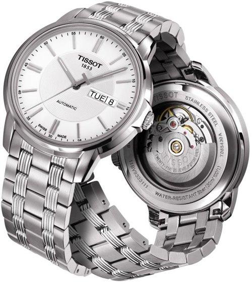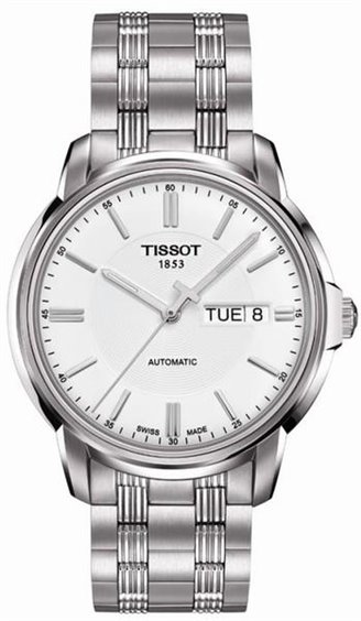 OROLOGIO TISSOT AUTOMATICS III solo tempo con giorno e data, cassa e cinturino in acciaio con chiusura a farfalla, movimento automatico svizzero ETA a vista, vetro zaffiro, quadrante bianco con indici silver, W.R. 3 ATM, misura diametro 40 mm. Swiss Made