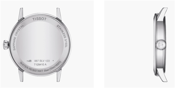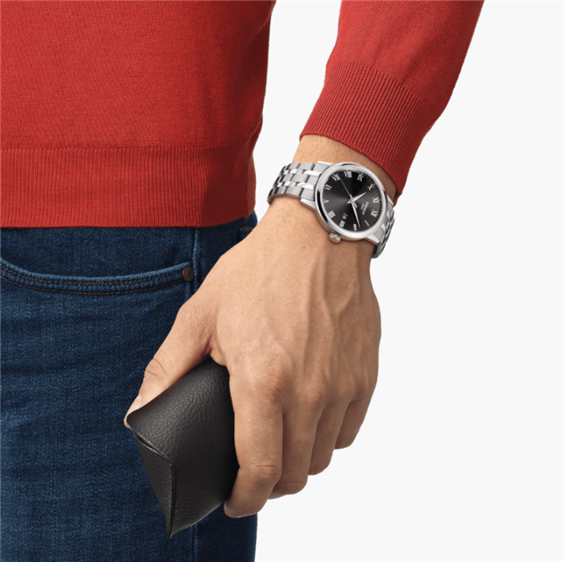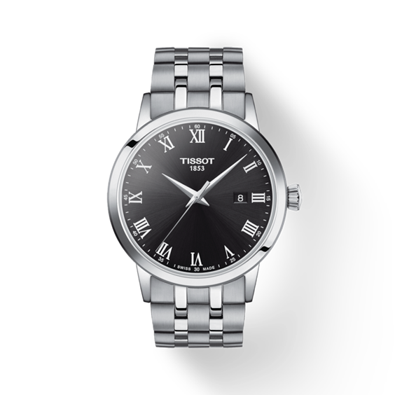 Tissot T-Classic versione Classic Dream T129.410.11.053.00 Questo orologio da uomo ha una cassa e un bracciale in acciaio inossidabile, un movimento al quarzo di fabbricazione Swiss e un quadrante nero con datario e indici romani.