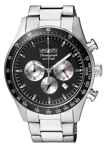 Orologio cronografo da uomo, con cassa in acciaio del diametro di 42 Mm. Quadrante nero con datario, cinturino in acciaio. Resistente all'acqua 10 atmosfere, movimento al quarzo.