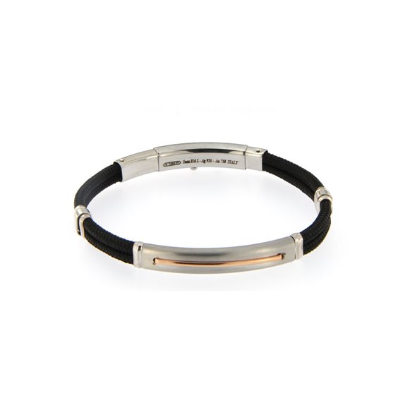bracciale in kevlar di colore nero con piastrina centrale in argento e impreziosita da un inserto sottile in oro rosa. Regolabile in 3 diverse misure . certificato di garanzia gr 1 di argento e oro 0,30 gr.
